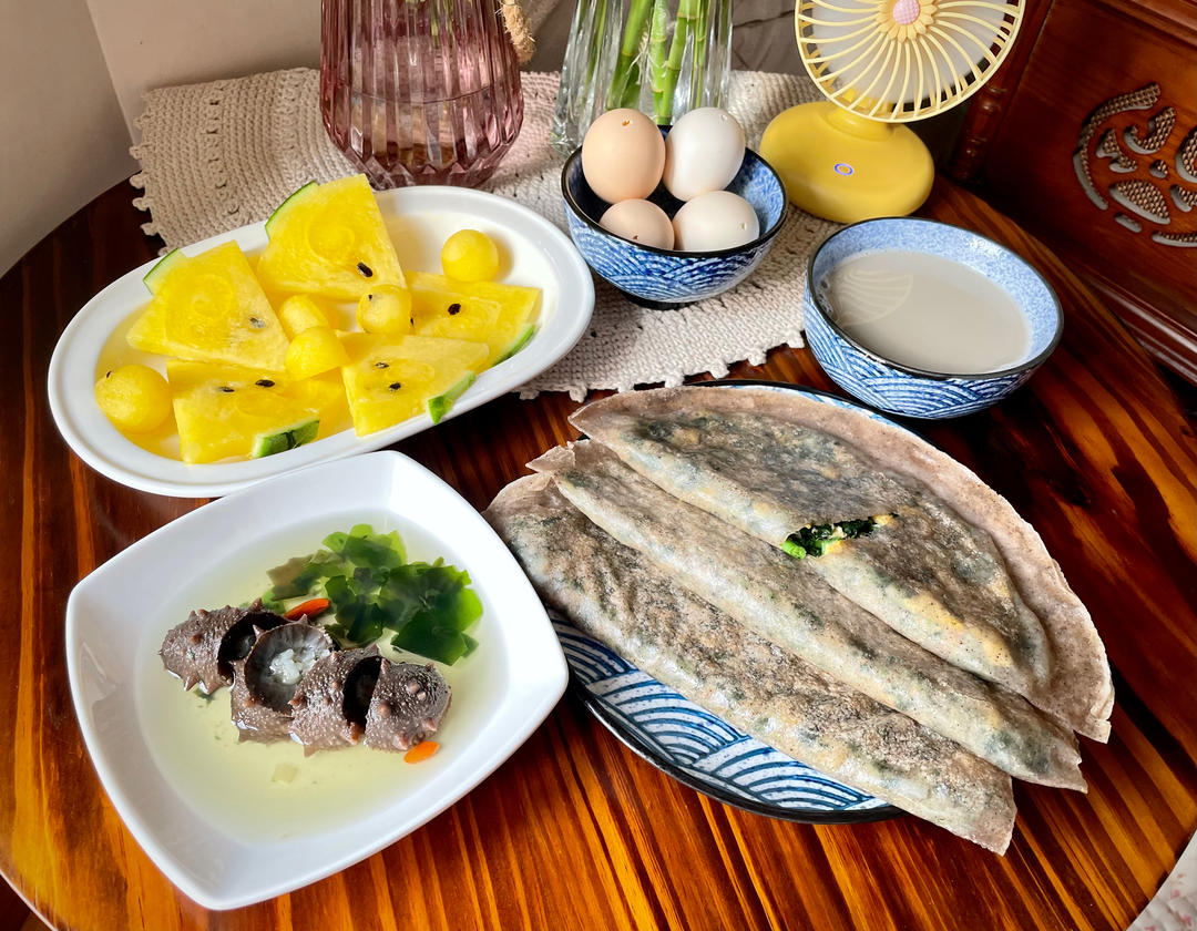 慧的美食每刻 做过 6月早餐马拉松 今日早餐~黑麦荞麦苋菜虾皮鸡蛋饼#野生海参#黑豆豆浆#鸡蛋🥚#西瓜友友们早上好!#早餐•2022年6月5日# https://www.xiachufang.com/ad/events/redirect_custom_url?rcu_variety=marathon">#定格我的早餐瞬间# 2022-06-05