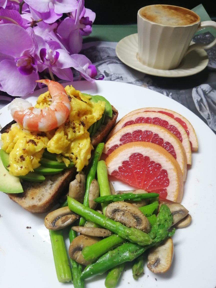 早餐日记……牛油果滑蛋三明治,芦笋炒蘑菇,葡萄柚,咖啡☕️