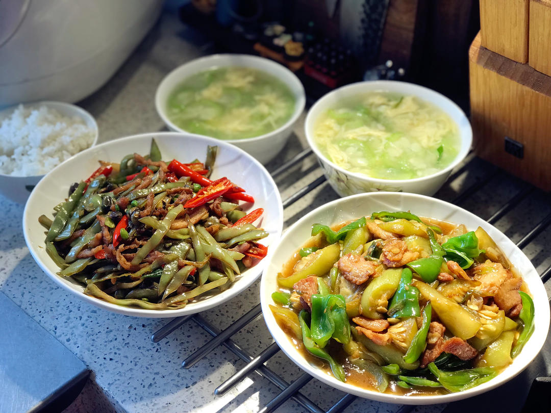 午餐全是自己种的菜,丝瓜辣椒炒肉片、眉豆辣椒炒肉丝,清清爽爽的丝瓜蛋花汤,主食米饭。🍚