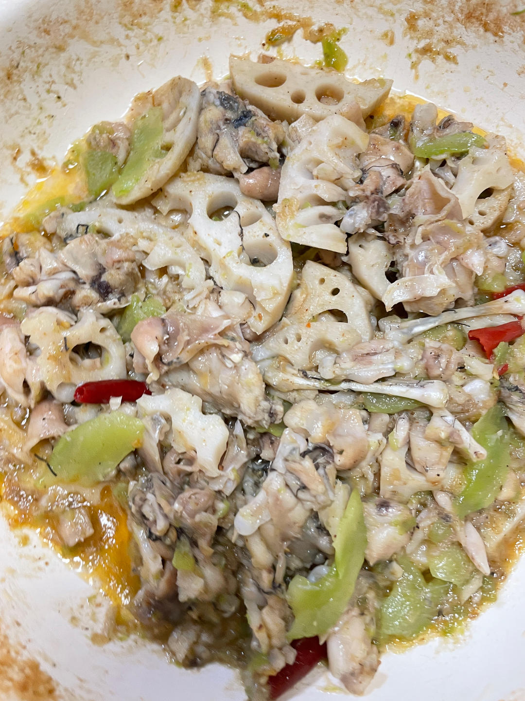 牛蛙锅,牛蛙炒一下,放入藕片,莴笋,北鼎珐琅锅,加点水小火焖15分钟出锅