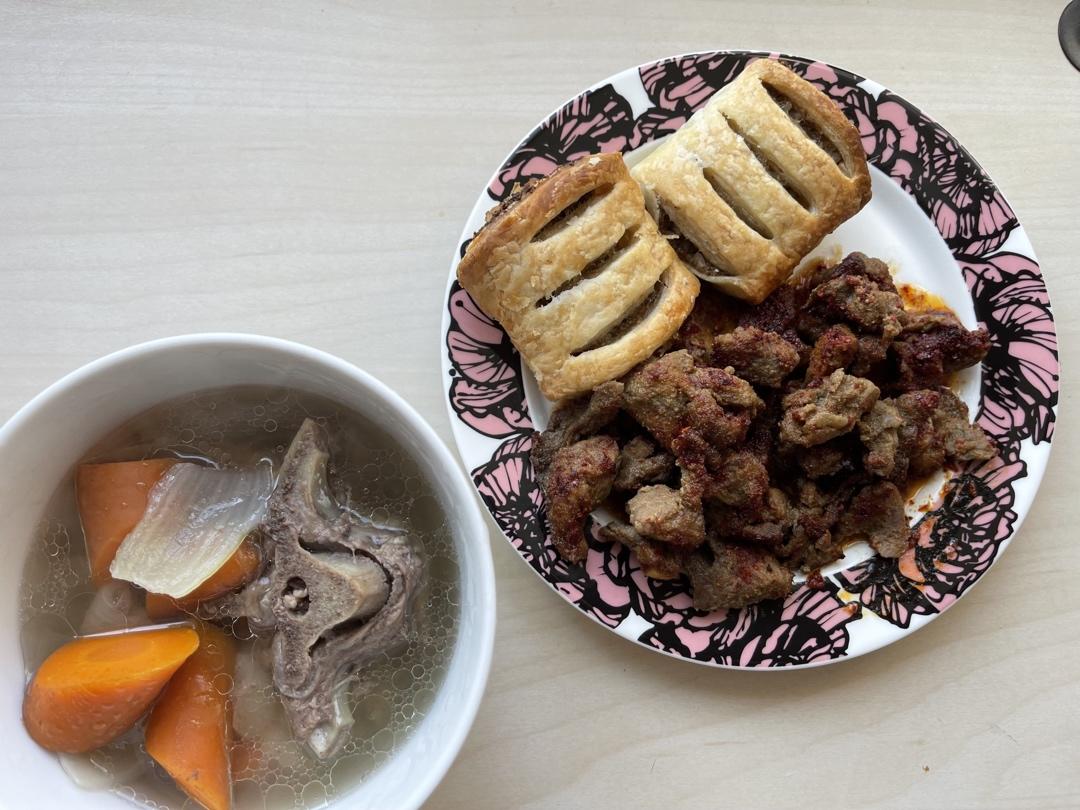 一顿五瓶养乐多 做过 2022年09月28日 羊肉切块加盐、很多孜然、少量食用油拌匀锡纸包住腌制入味,220度预热后烤20分钟,打开锡纸再烤15分钟,撒辣椒粉烤5分钟羊骨带肉焯水后加少量盐,洋葱,胡萝卜,炖汤模式2.5小时即可 2022-09-28