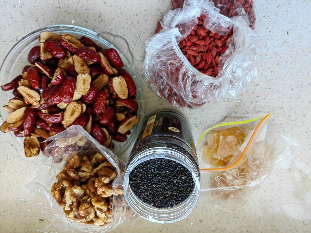 叶子贝贝 做过 2022年11月07日 阿胶250克,古越龙山黄酒500ml,红枣和原味核桃分别250克,枸杞和熟芝麻分别125克,冰糖110克黄酒泡阿胶一两天,上锅放冰糖小火至融化,边熬边搅拌,大约50分钟后挂旗关火,放核桃,红枣搅拌均匀,放枸杞和芝麻,搅拌均匀,盛起整形压平,放冰箱冷藏,第二天切片包装。 2022-11-07