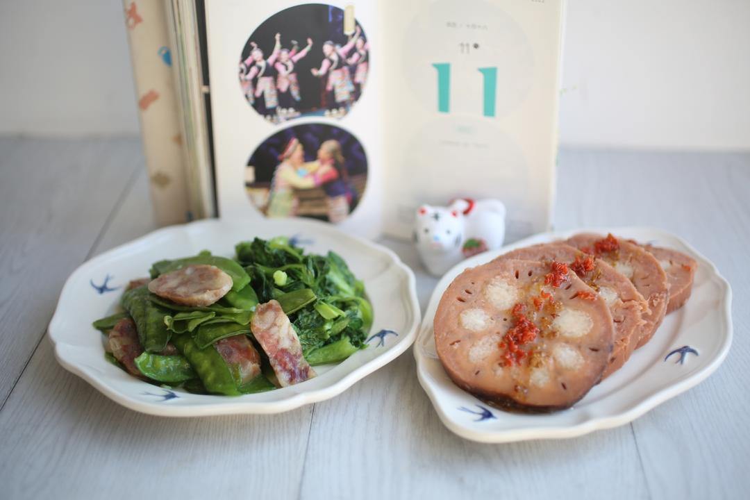 2022/11/11十月十八:桂花糖糯米藕/荷兰豆炒香肠/青菜