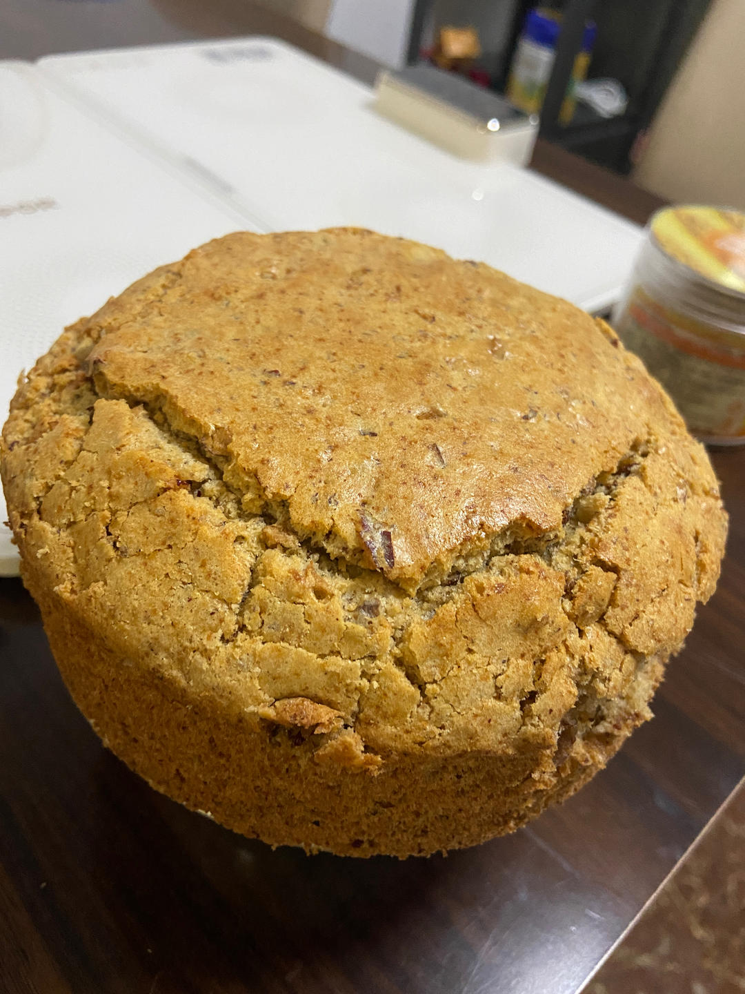 第一次做,没有蜂蜜和朗姆酒,糖一共20克,用的6寸蛋糕模,170度30分钟正好,娃和我们都很喜欢,下次可以再少点糖