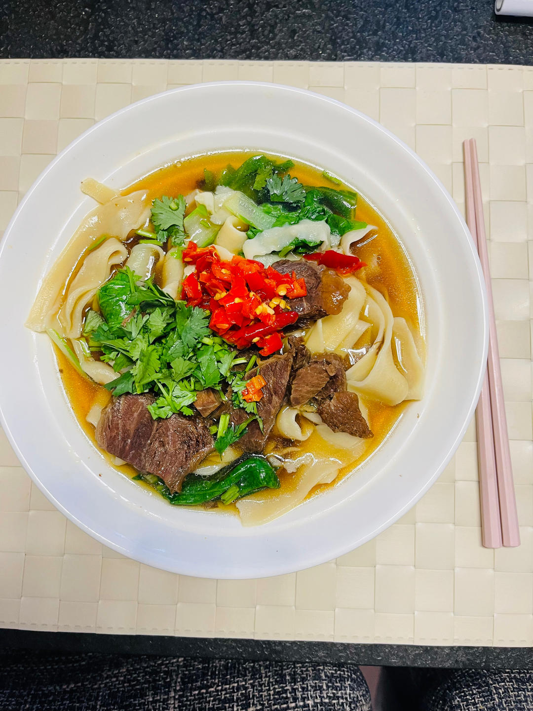 银汐漫 做过 老南京祖传干切牛肉(牛腱) 牛腱子忘了拍了传个牛肉面吧。头一次先腌后卤,可能腌制过程盐放少了也没啥味道,下次也大可不必。以后还是按自己习惯卤就好然后汤里多放盐吧。上次在苏州吃到甜口牛腱子惊艳到我了#晚餐•2022年12月18日# 2022-12-18