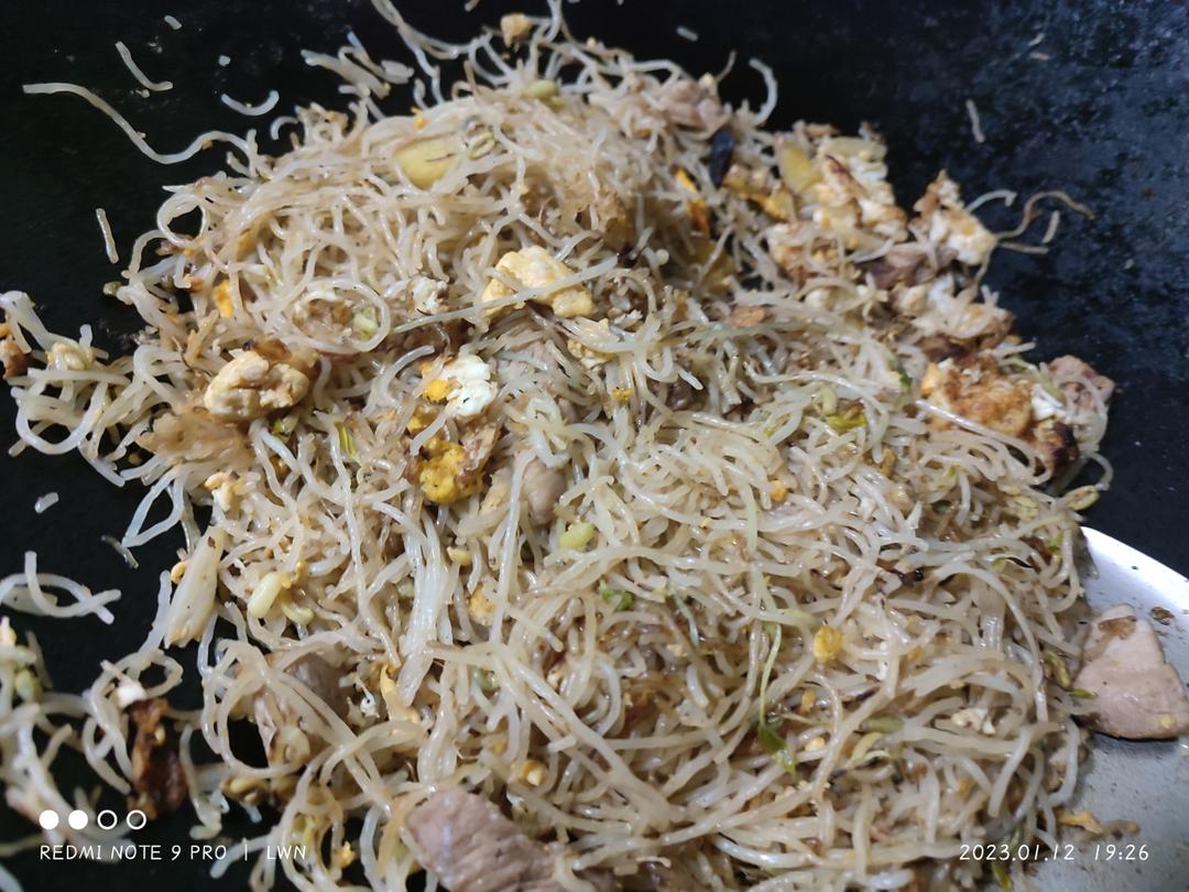 第2次因为更熟练吧,可能那个大锅火力也更大一点,炒出来的米粉不会有那种成团不干的情况,炒的比第1次好,但好像又有点略咸了一丢丢?反正把前面那一次剩的一点和后面的这一次翻在一起刚刚好。