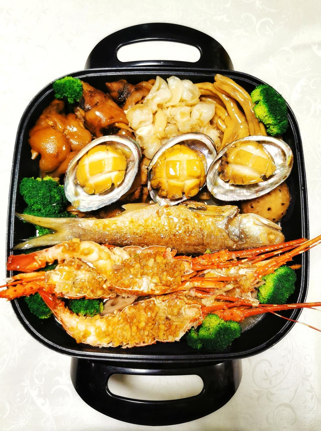 木瓜小厨房 做过 晚餐•2023年1月21日 #晚餐•2023年1月21日# 除夕之夜,十全十美,盆满钵满底下铺骨头汤炖的白萝卜和莲藕摆上卤好的猪手和鸭掌再铺上花胶,清蒸好的小青龙,煎好的午鱼鲍汁焖出来的鲍鱼,大花菇,西兰花 2023-01-21