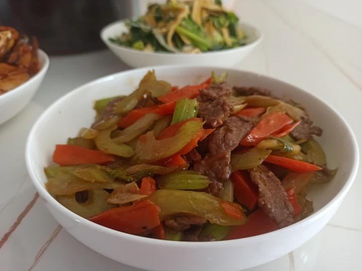 芹菜胡萝卜炒牛肉 大蒜炒千张 排骨炖山药 红烧鲫鱼