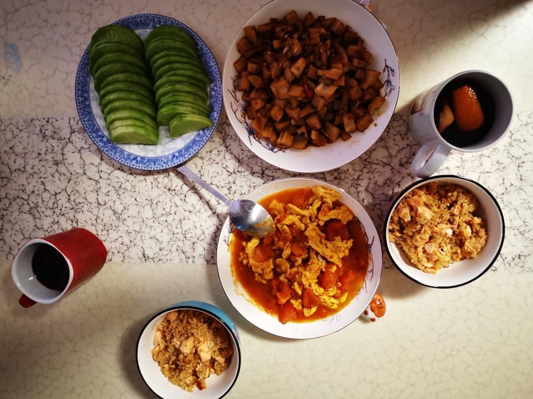 三文鱼闷饭 西红柿炒鸡蛋 糖醋藕丁 青萝卜 热红酒