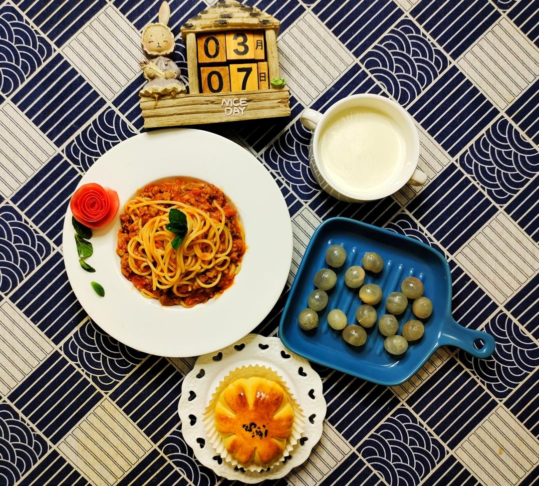 我的早餐我做煮,又是一个联考的日子,早餐简单一份西红柿肉沫意面,一杯芋泥牛奶。