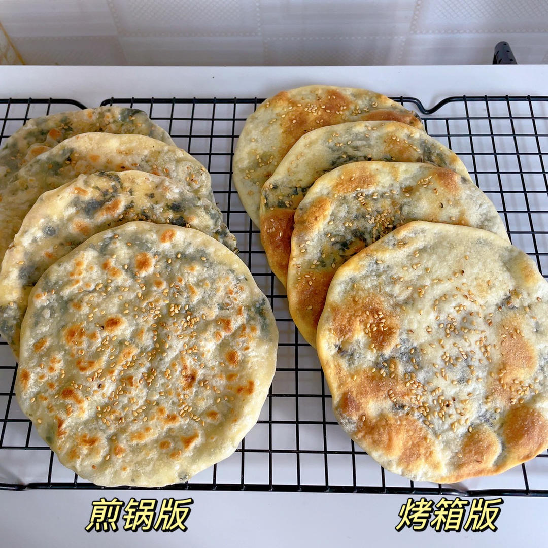 煎的比较有韧性,烤得更像外卖的烧饼脆脆的。更爱烤箱版