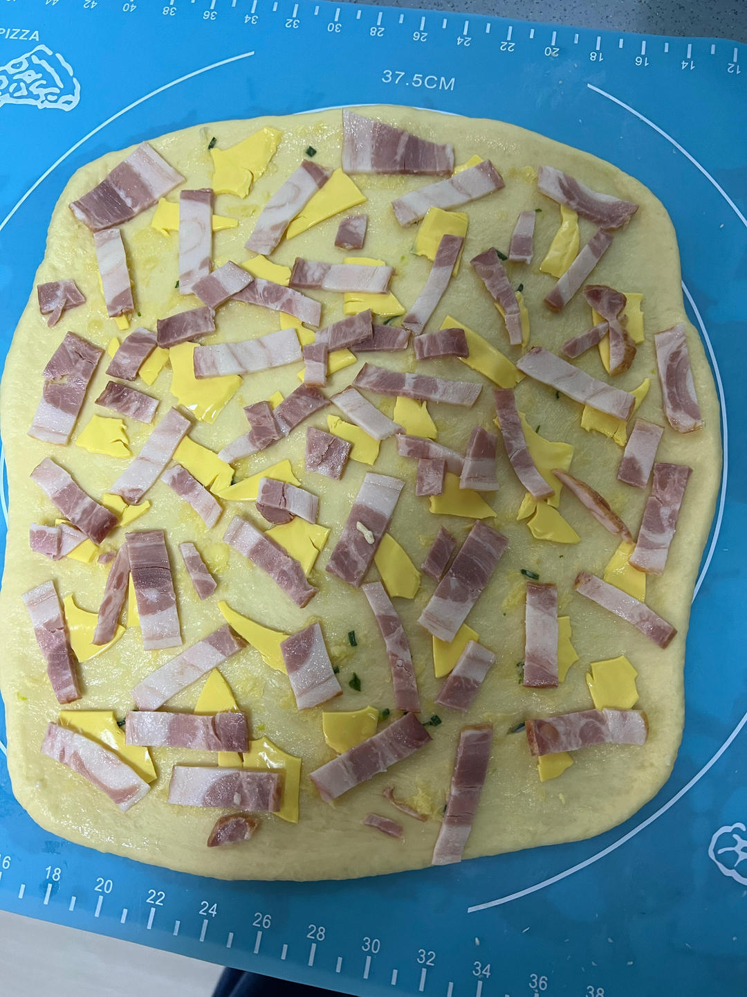肉类更换了培根 黄油蒜蓉一起涂抹内部 一激动 对半切 编麻花了 另一半黄油蒜蓉涂抹在表面 和椰蓉面包一起烤 完胜!