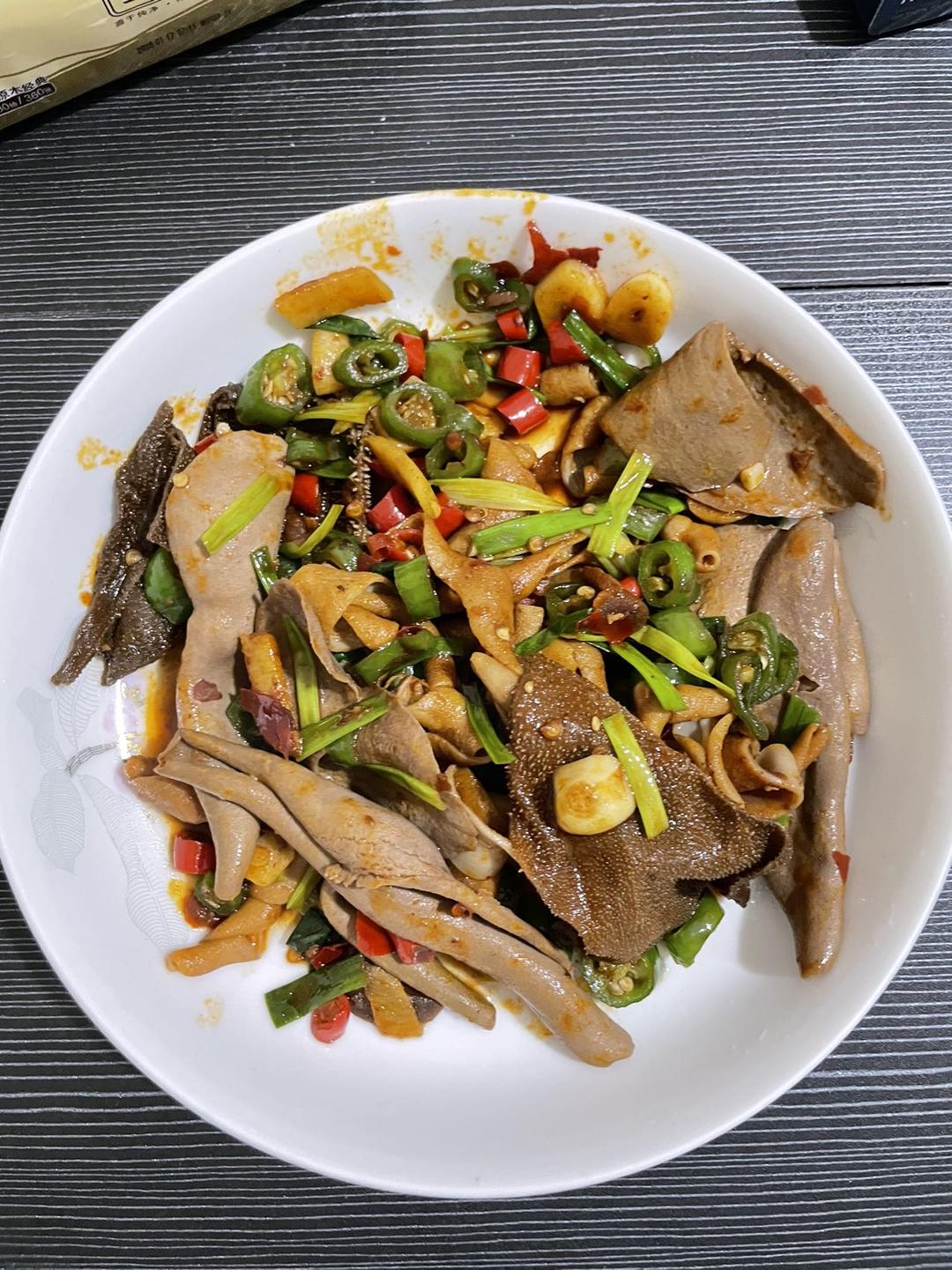 在外面吃火锅点多了吃不完打包回家做个爆炒,有猪腰片、鹅肠、毛肚,加豆瓣酱和葱姜蒜青椒一起爆炒即可