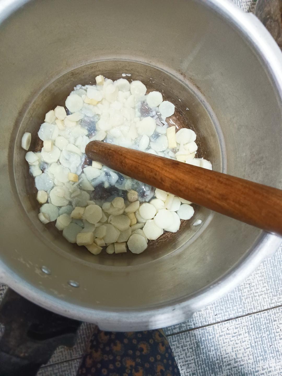 山药捣烂,加入糯米粉,一点澄面,里面包上馅,小火煎熟。