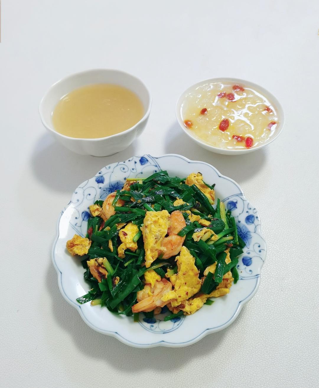 小吃小痴 做过 晚餐•2023年4月6日 银耳汤&葛根粉&韭菜虾仁炒蛋~明明一小朵就够了,偏泡两朵,喝了一天。葛根粉山药粉生姜粉少量水搅匀,开水冲泡。头茬韭菜,好好对待。嘿嘿,打出了双黄蛋。#晚餐•2023年4月6日# 2023-04-06