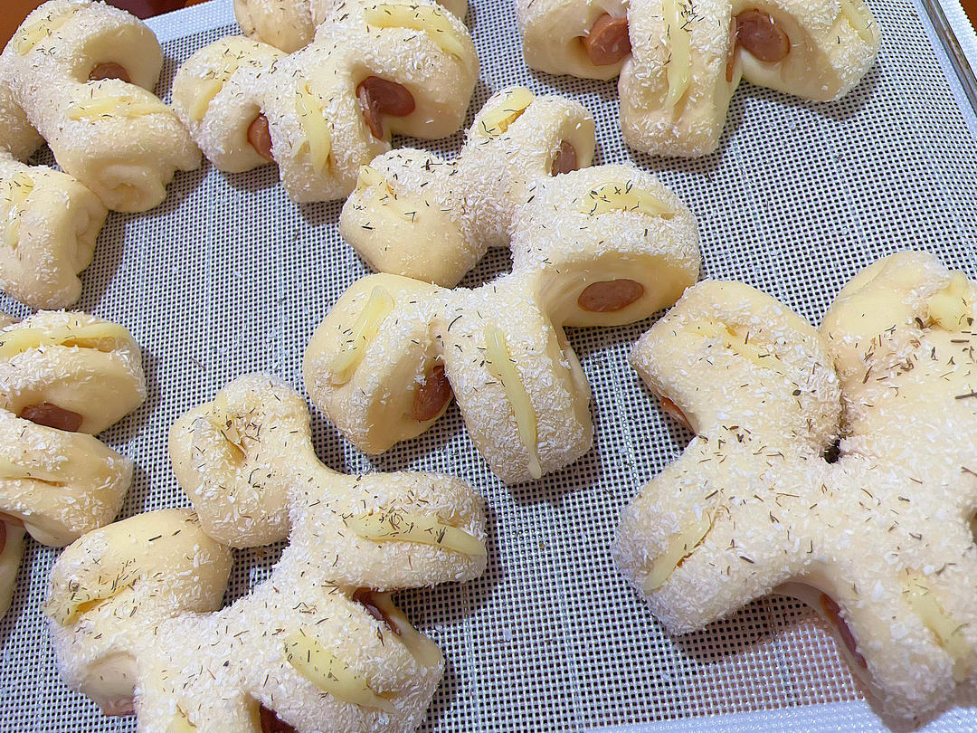 没有芝士粉,用的椰蓉代替,用沙拉酱代替了黄油馅,大成烤肠非常香😍