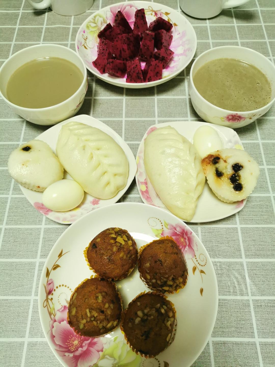 周四:黑芝麻米汁,肉沫包子,鸡蛋,核桃黑米糕。火龙果!