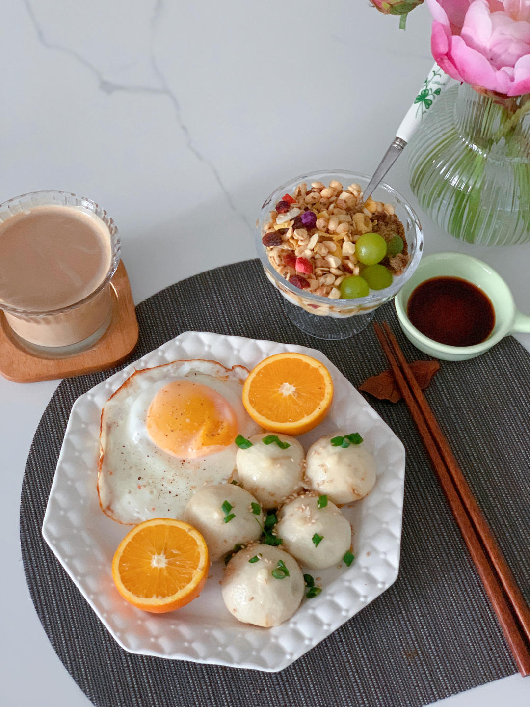 最近没什么胃口,换点食材调一下胃口吧,今天生煎包、鸡蛋、炼乳咖啡、酸奶杯
