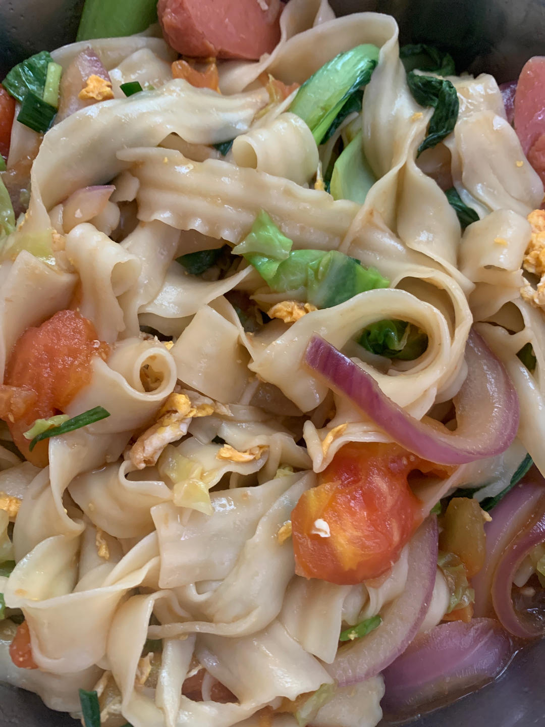 大冬子luolibasuo 做过 2023年06月08日 炒面包菜丝 洋葱丝 柿子 青菜 火腿 葱蒜煮面七八分熟 过凉水控干 面条加老抽加食用油分别搅拌均匀热油打蛋 葱蒜炒香 加所有配菜大火多炒一会加 生抽 盐 味精 糖炒均匀 加点清水加面出锅前加点锅边醋 2023-06-08