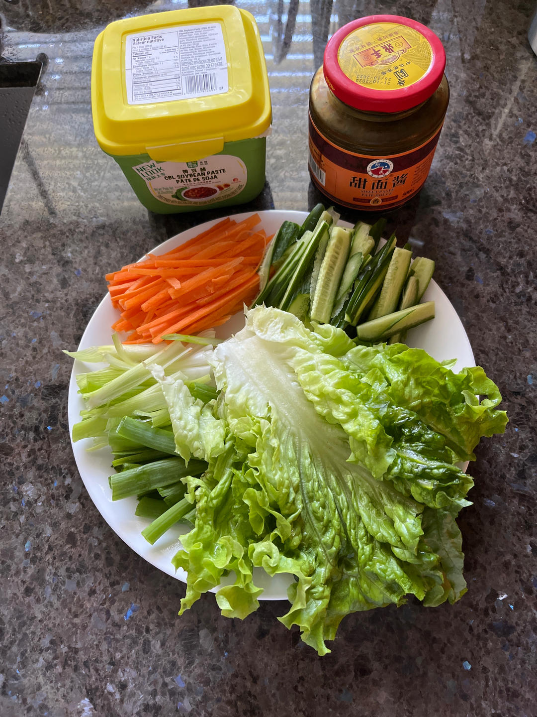 没炒鸡蛋酱,只是沾黄豆酱和甜面酱。