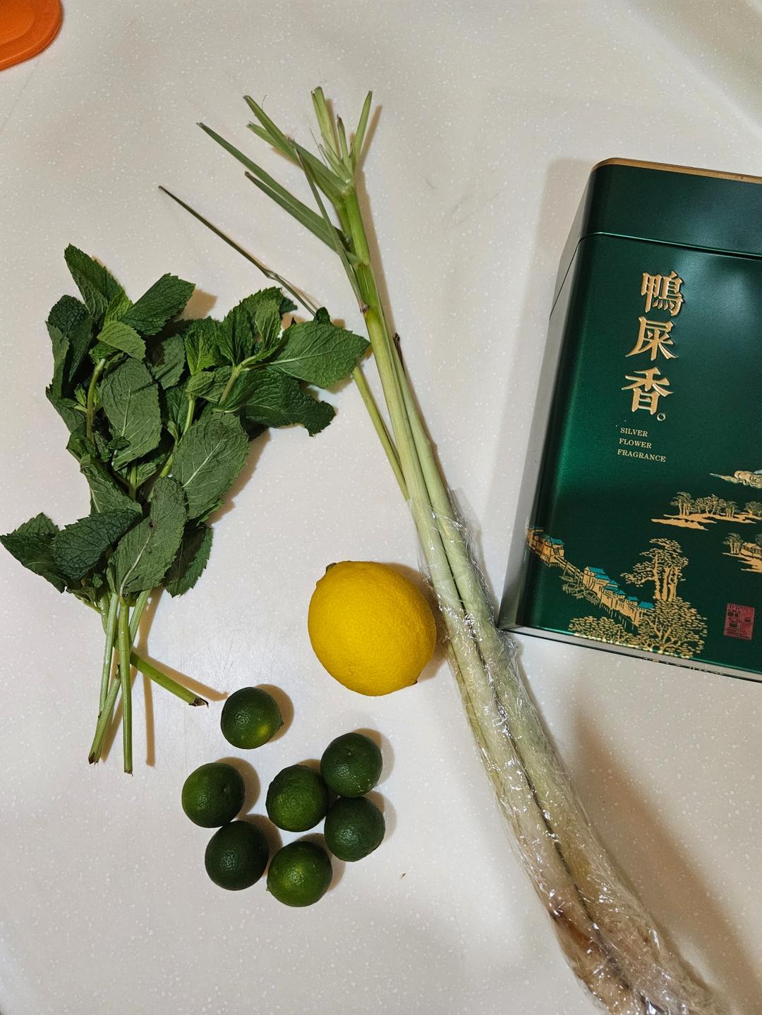 冰箱里还有点香茅、薄荷叶啥的,捣鼓个暴打“大葱”(香茅)鸭屎香柠檬+detox water这不,好喝又实惠嘛!
