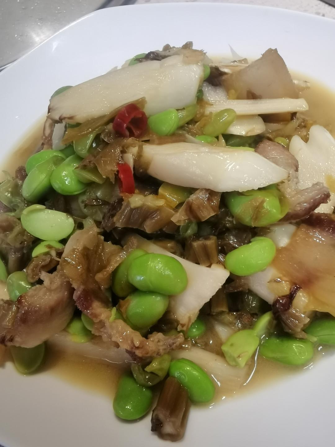 扁笋毛豆肉咸菜肉片+秋葵蒸懒惰肉,鲜的掉眉毛🤭
