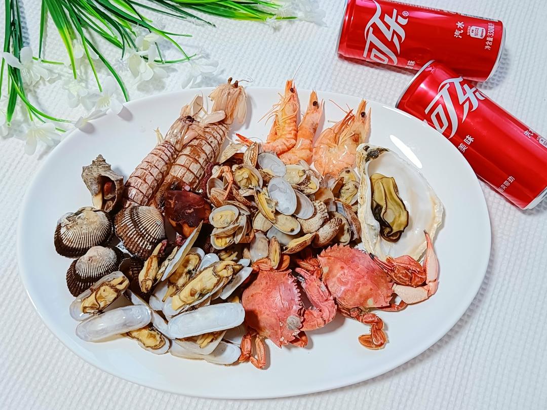 海鲜聚会,出锅赶紧每一种放几个装一盘,搭配可口可乐清凉一夏😍😍