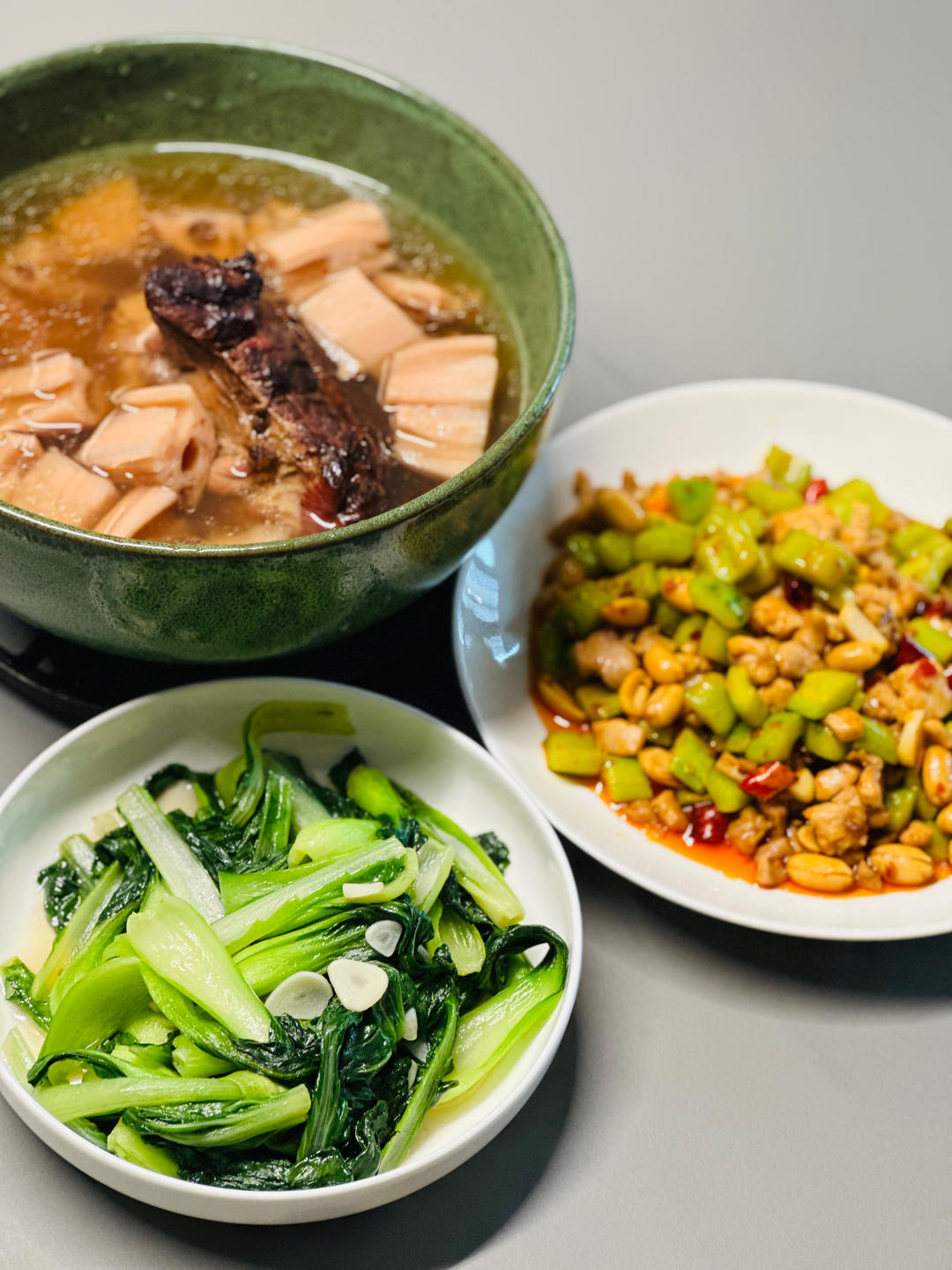 黄瓜鸡丁,清炒小白菜,以及藕炖腊蹄髈。