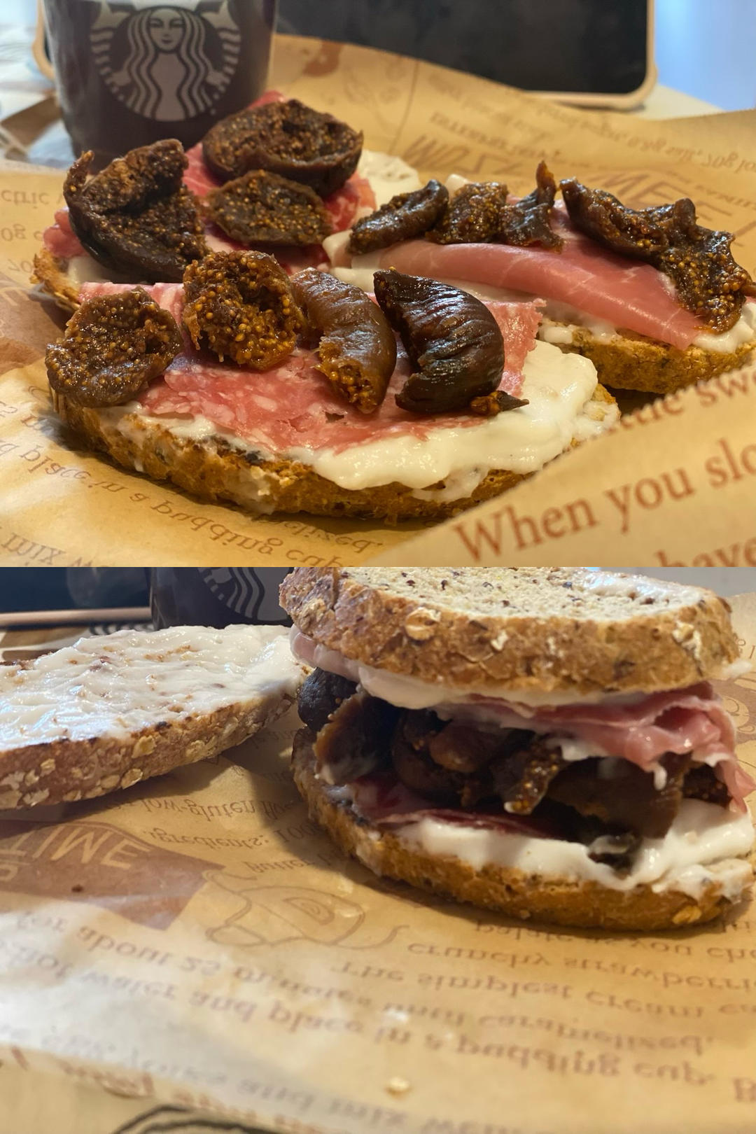 zyw0421 做过 早餐•2023年7月31日 #早餐•2023年7月31日# #开放三明治# 意式无花果三明治,加了萨拉米,意大利熏火腿和香肠,涂了过滤的椰子酸奶,植物酸奶口感比正常的酸奶更清爽,有淡淡的椰子香气,偶尔吃腻了酸奶换换口味也不错👍 2023-07-31