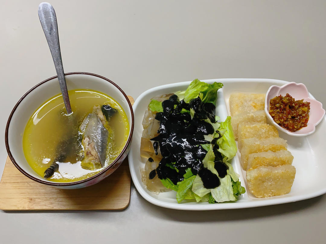 五指毛桃鸡汤+猪皮冻+生菜沙拉+黑芝麻酱+糍粑块