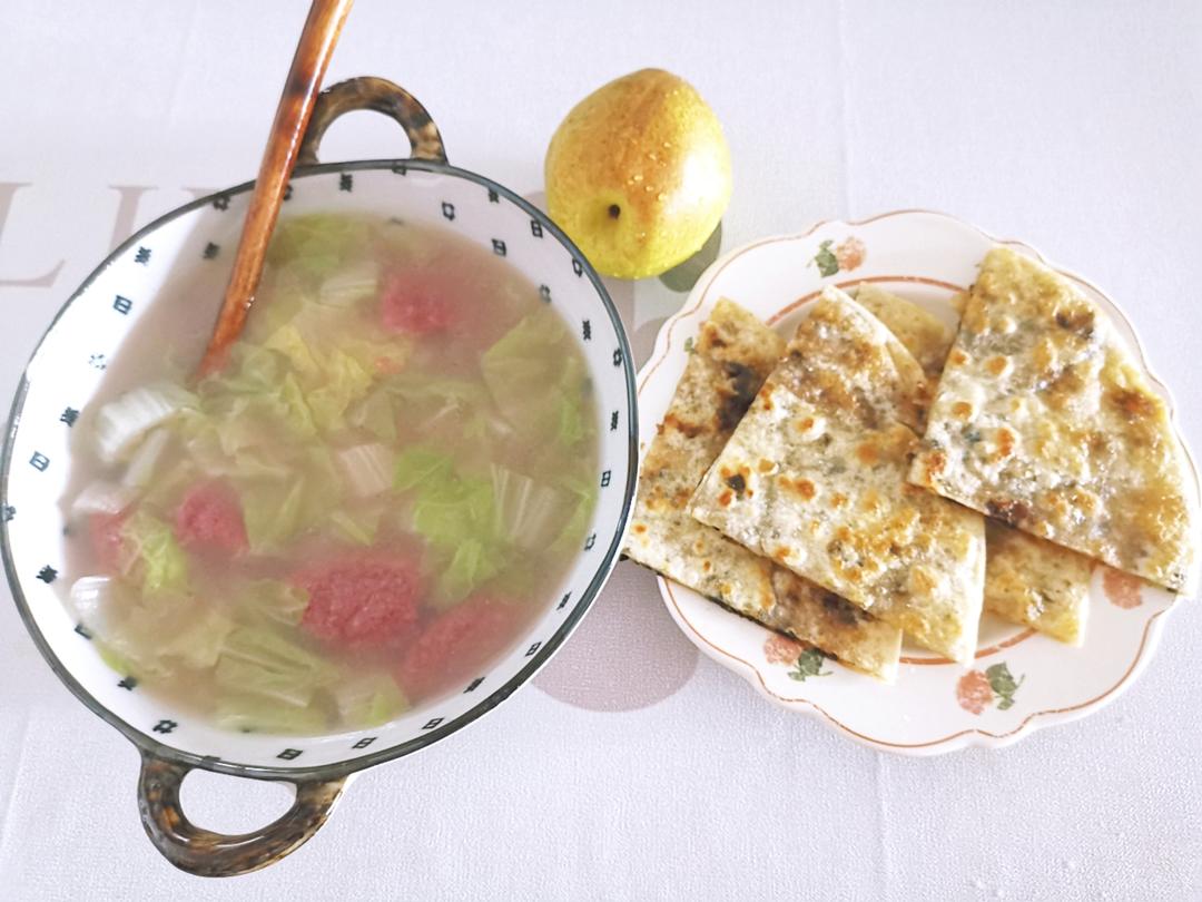 早餐:青菜煮高粱糍粑,梅干菜手抓饼,香梨