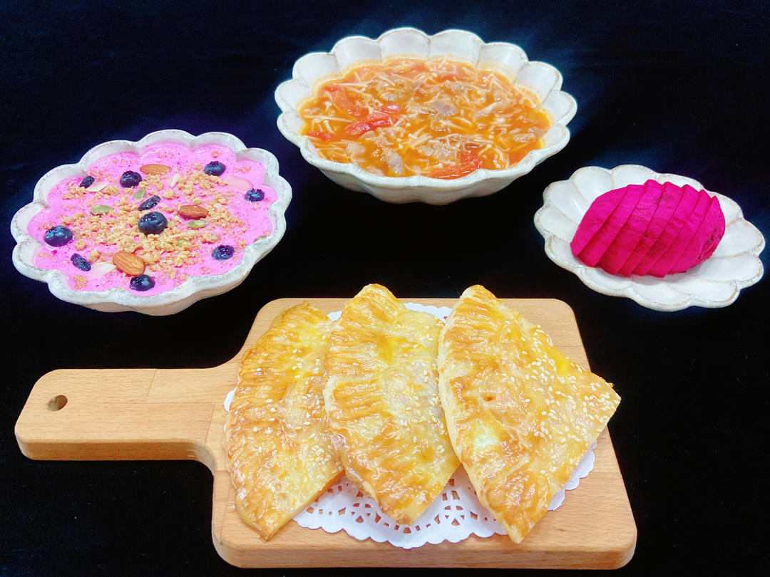 #定格我的早餐# 红薯芝士饼🍠🫓+蕃茄菇菇肥牛汤🍅🍲+火龙果奶香燕麦碗🥣+红心火龙果;今早的脑子不好使 芝士还提前拿出来解冻好的 本来想着底下铺一层芝士 接着红薯泥 上面在撒一层多多芝士的 结果铺好薯泥直接把饼盖上了 想掀下来已经不行了 这个黄油手抓饼跟其他手抓饼完全不同 一拿出来就粘的特别厉害 还好底下有铺一层 真的好无语😓#早餐•2023年9月12日#
