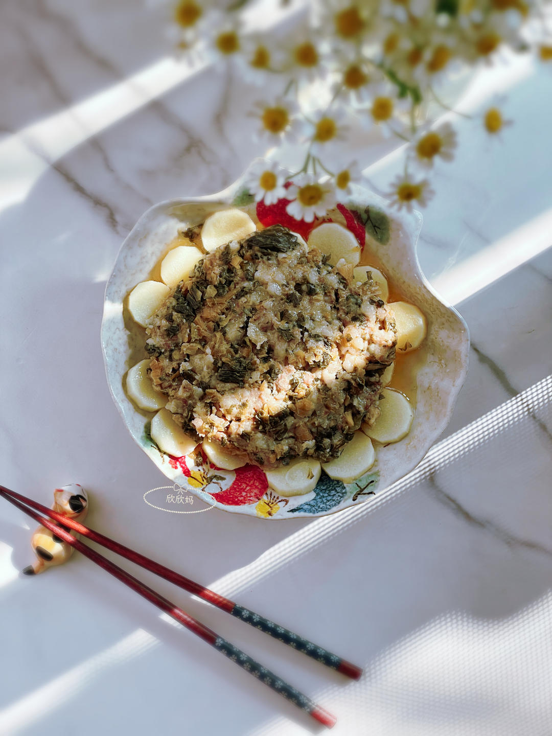 淮山蒸梅菜肉饼,淮山切薄片铺在肉饼下面,吸收汤汁很下饭。