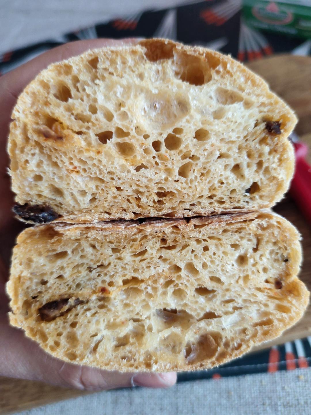 S_马卡龙_S 做过 恰巴塔面包 Ciabatta #早餐•2023年10月29日# #面包面包💕# 麻辣鸡枞菌恰巴塔200g高粉+100g多谷物粉 水240g+后加15g 甜椒粉2g+麻辣鸡枞菌1小袋+烧烤蘸料 海盐6g;鲜酵母6g;橄榄油20g 2023-10-29