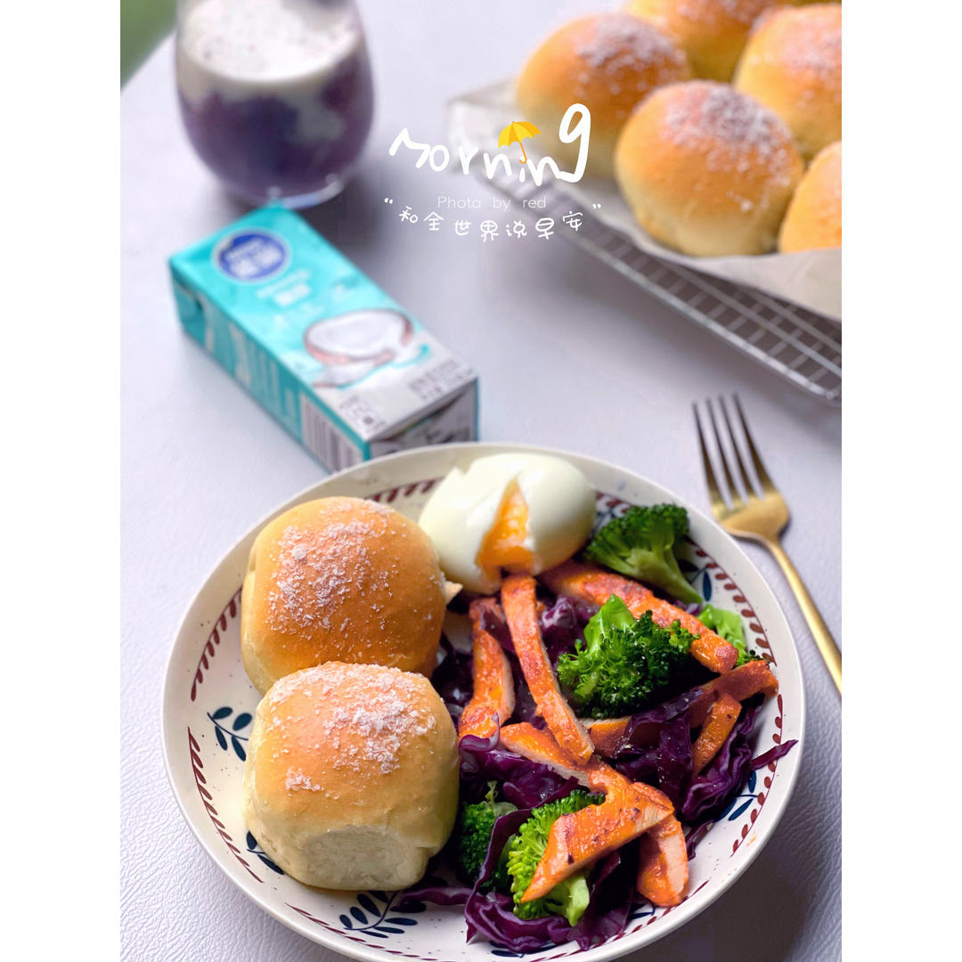 椰香小面包➕椰香芋泥鲜奶➕鸡扒蔬菜沙拉