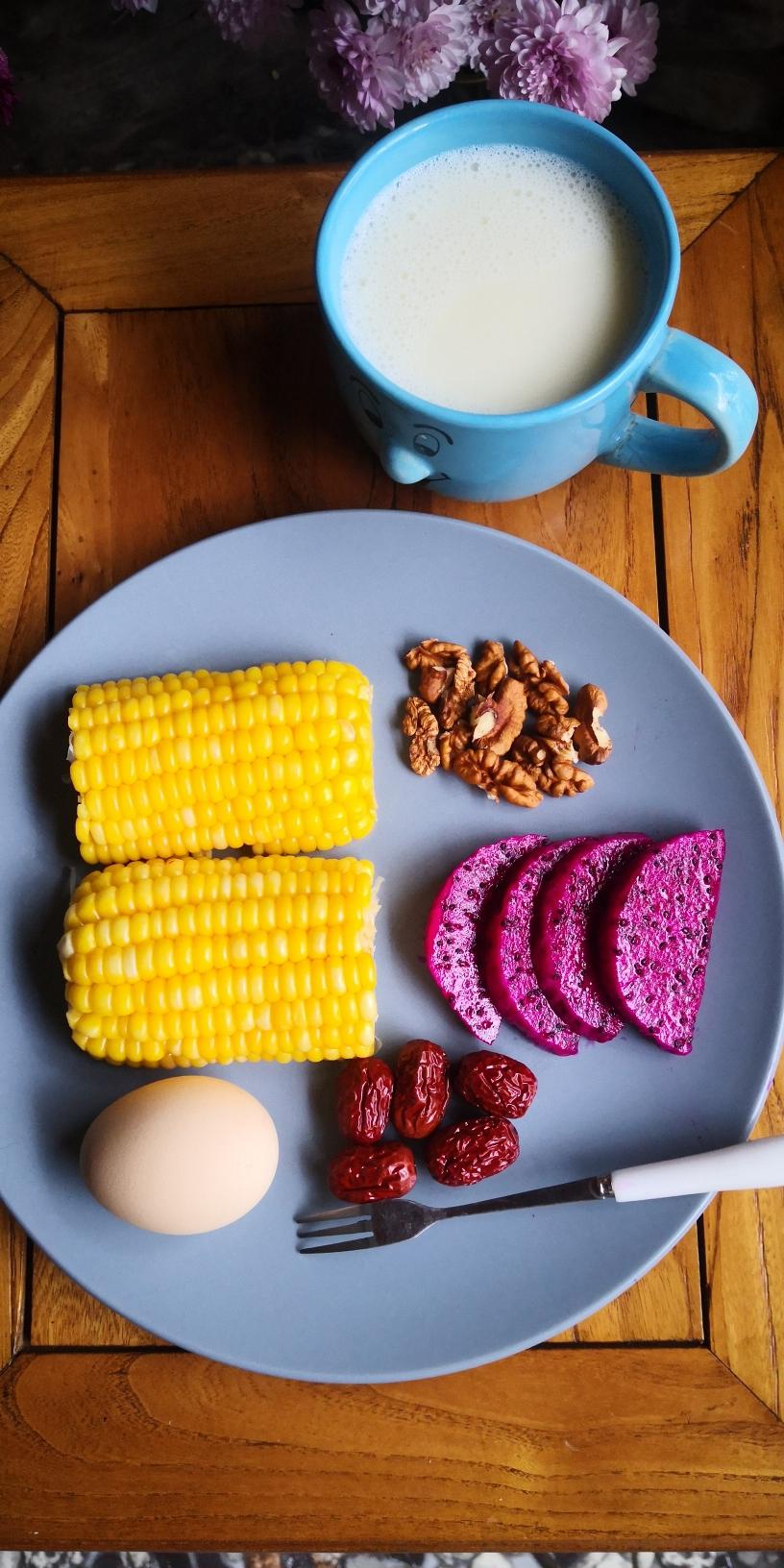 玉米+鸡蛋+大枣+火龙果+核桃+豆浆