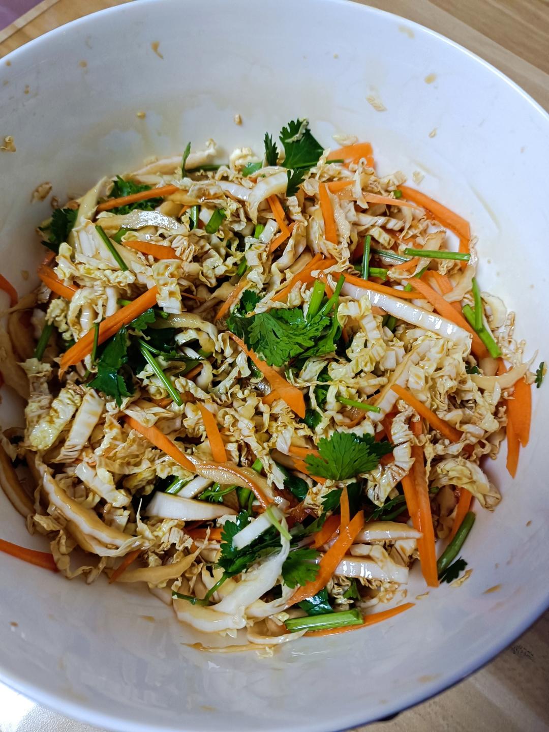 白菜心切越细越好,胡萝卜丝,香菜段,