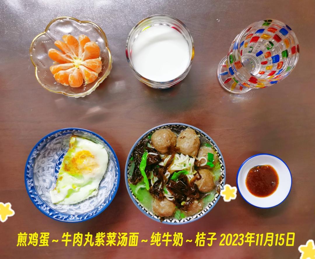 我家宝贝的早餐:煎鸡蛋~牛肉丸紫菜汤面~纯牛奶~桔子