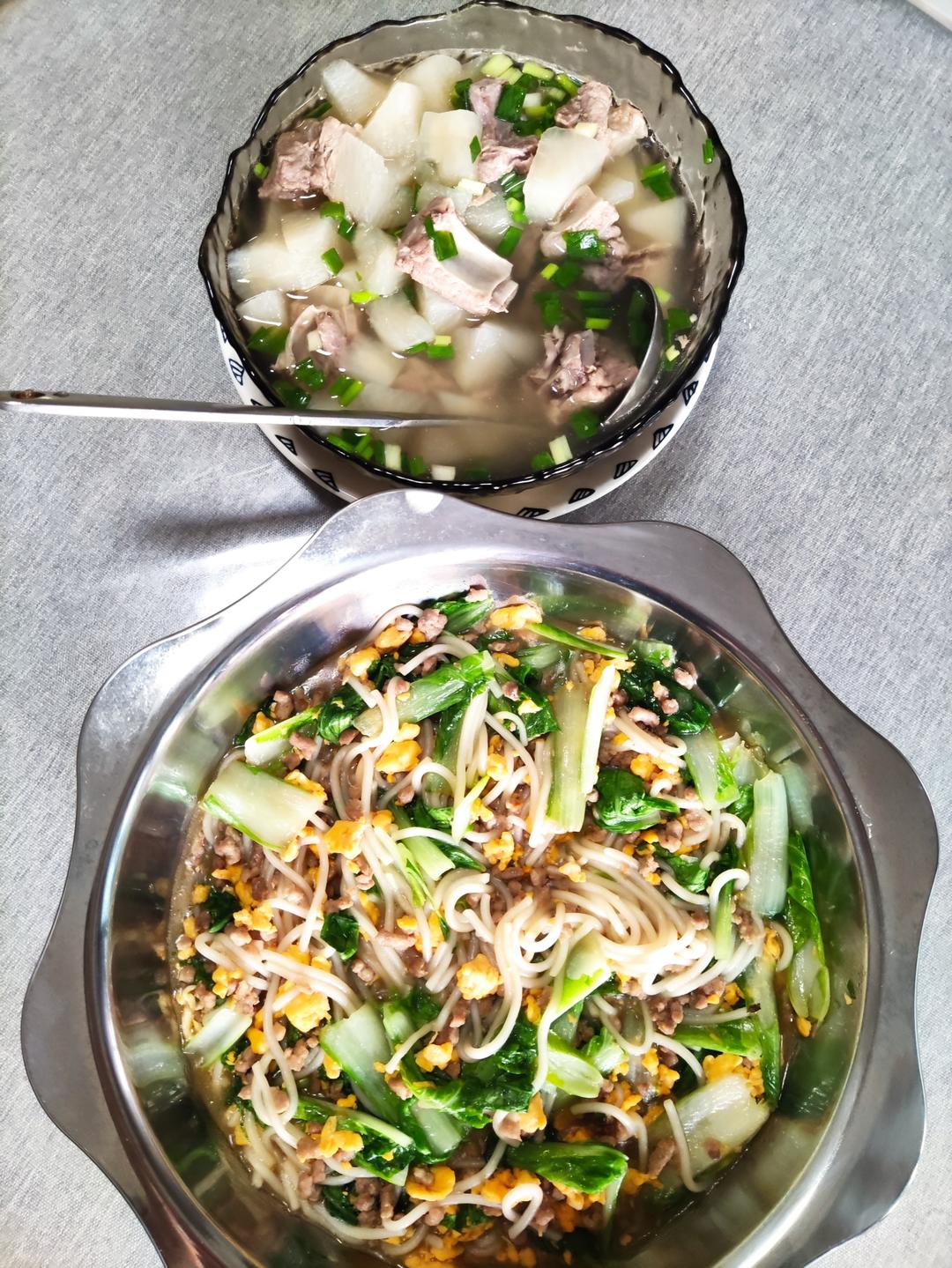 猪肉末白菜鸡蛋捞濑粉、白萝卜排骨汤