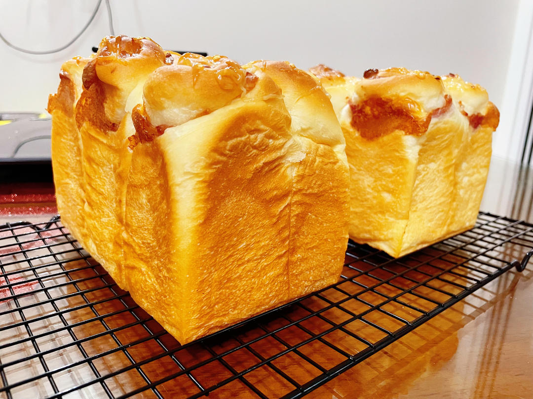 皓皓hao 做过 烫种鲜奶吐司 原配方减了30克牛奶,整形加了芝士和培根,其实这款咸口吐司,啥不放就是款奶香浓郁松软细腻的吐司,超爱它,下次再做#早餐•2024年3月5日# 记录 底部加了三能烤盘150-230,烤了34分钟 发酵32度80% 85分钟 含水量大,打面6档 2024-03-05