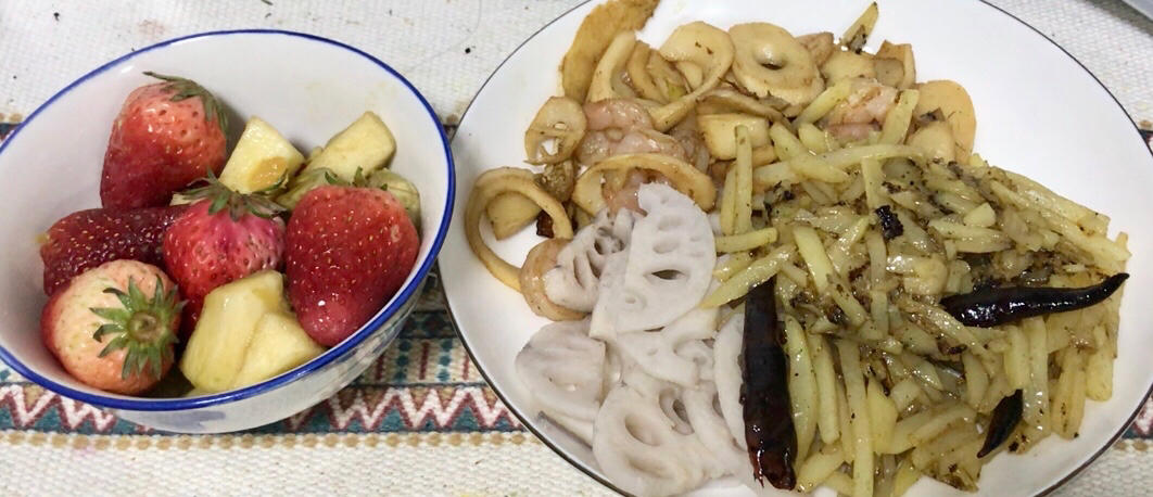 春笋炒虾仁,蚝油土豆片,素炒藕片,水果沙拉