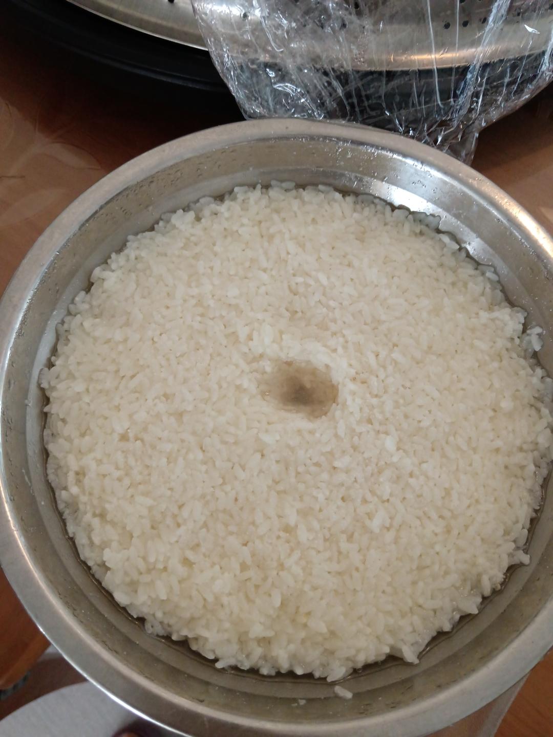 简单点:电饭煲煮好,直接倒入纯净水或者是矿泉水降温到二三十度左右,放酒曲搅拌均匀压紧发酵,倒出来在盆里面发酵也可以