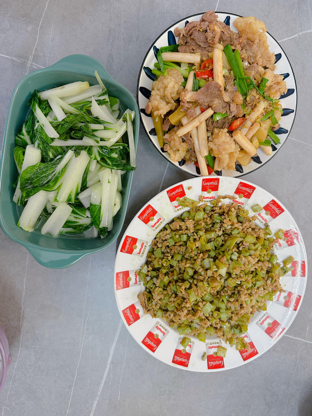 藕尖炒肥牛、榄菜豆角肉末、小白菜🥬