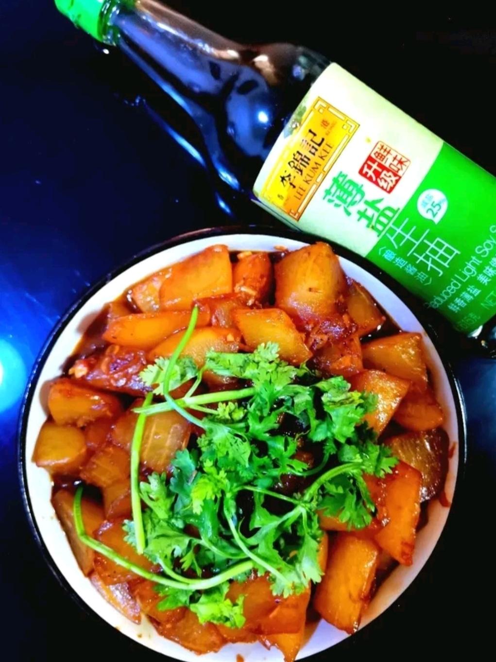 娜娜食堂 做过 李锦记x下厨房夏日轻食必吃榜|薄盐一夏 让轻食更美味 虾皮素烧白萝卜姜蒜末加一把虾皮炝锅,加入切成滚刀块的白萝卜大火翻炒,炒出白萝卜的辣气,然后加入两勺李锦记薄盐生抽,适量盐和鸡精,一碗开水,转小火炖20分钟,至白萝卜透明,盛出装盘,点缀香菜,萝卜软糯,淡淡的海鲜味道,配米饭很好吃! 2024-06-11