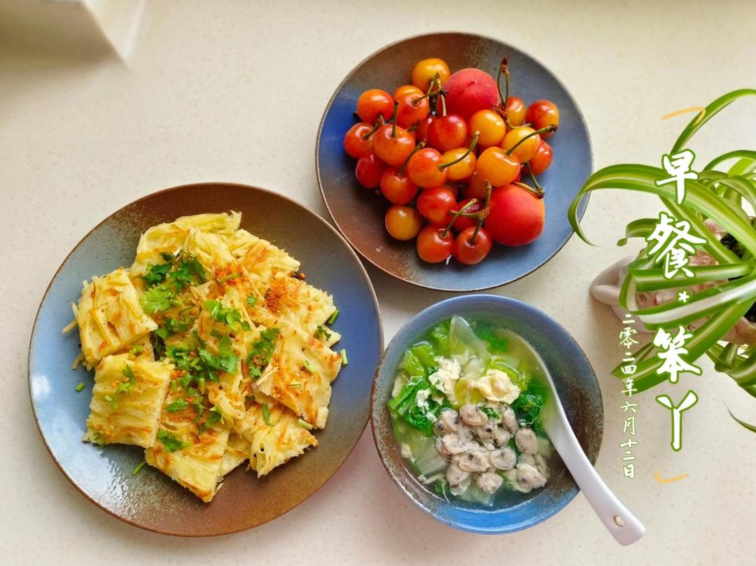 笨丫BenYa 做过 早餐•2024年6月12日 在娴静世界里,用心做一餐,牵一片光阴于馨香里,给时光一份浅浅的回眸,给心灵一份淡淡的安暖。今日早餐:土豆丝饼,蛤蜊蔬菜蛋花汤,水果。#早餐•2024年6月12日# 2024-06-12