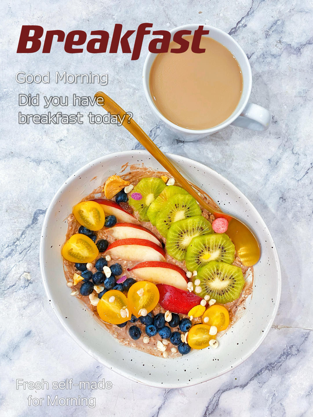 早:☕奶咖🥝🫐🍑🍅🥣可可粉酸奶燕麦粥