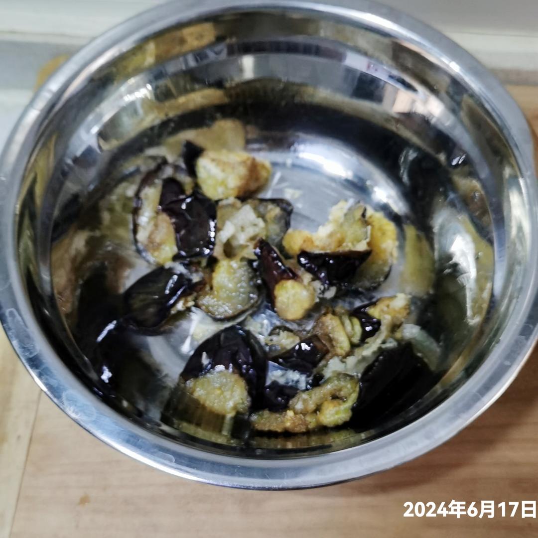 茄子腌,裹了玉米淀粉,炸。