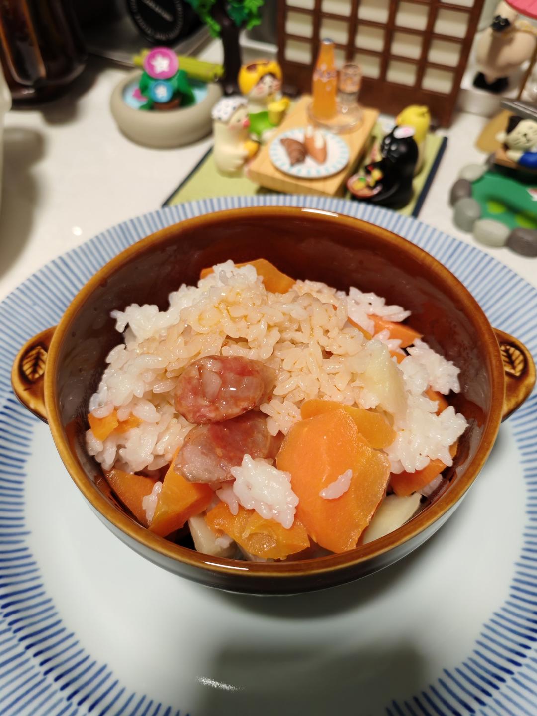 不想油炒菜,就水煮了一下土豆胡萝卜,和米饭腊肠用电饭煲做好,拌捞汁吃。