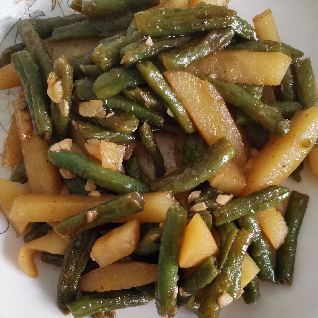 土豆要水里串下再煸 不然煸不熟啊 刀豆也水里串了下 煸的。好吃的