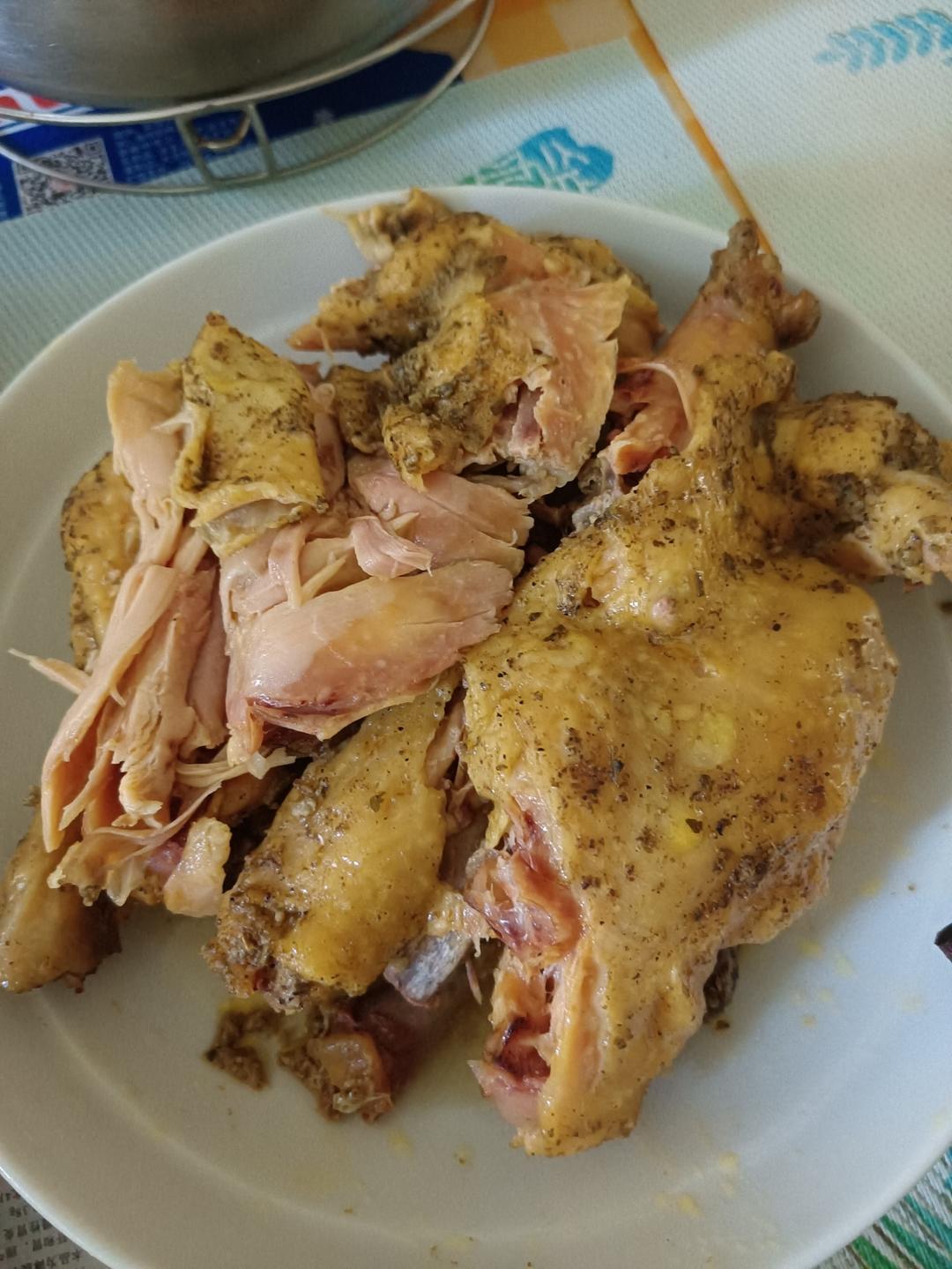 900克净鸡一只,蒜香料腌一晚,电饭锅煮饭键一个程序 。满屋喷香